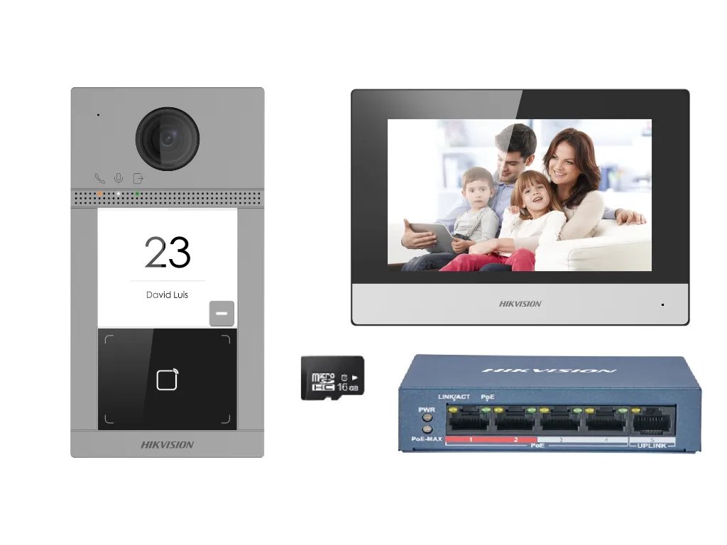 - Vrátane: DS-KV8113-WME1(C) × 1, DS-KH6320-WTE1 × 1, 4-portový štandardný prepínač PoE × 1, 16 GB karta TF × 1