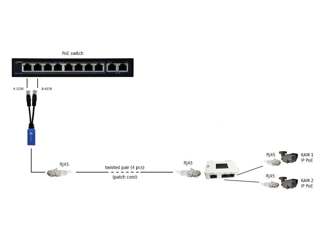 - Prenos dát a napájania dvoch PoE IP kamier súčasne s použitím jedného sieťového kábla.