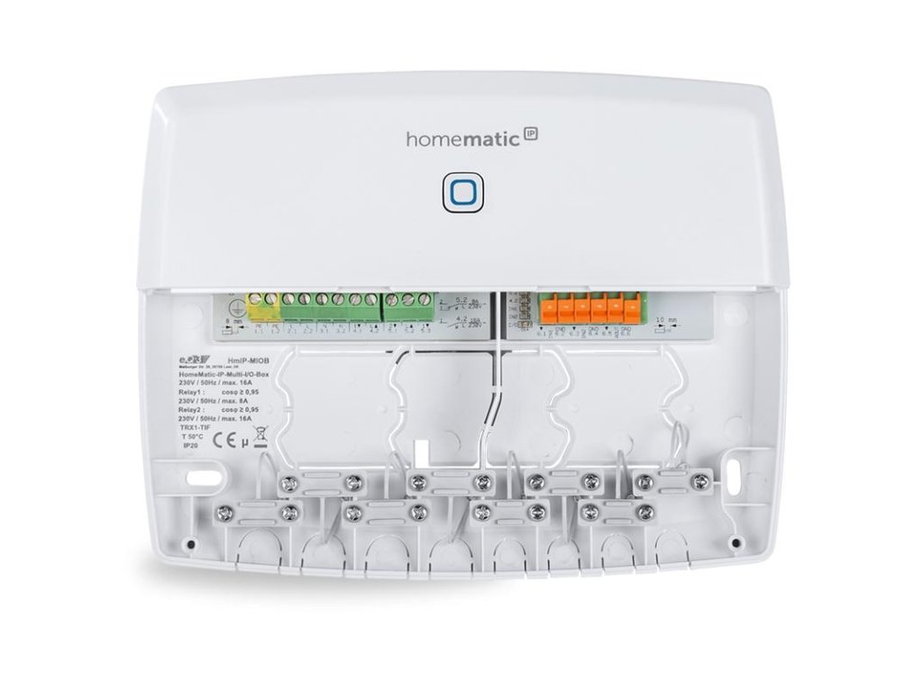 Multi IO Box (HmIP-MIOB) preberá rolu centrálneho prvku vo vykurovacom systéme, ktorý umožňuje ovládať 2 kanály pre pripojenie vykurovacích a cirkulačných zariadení. Pripojené zariadenia je možné ovládať vzdialene v kombinácii s Centrálnou jednotkou (HmIP-HAP) a mobilnou aplikáciou Homematic IP. Inteligentné spínanie vykurovacieho systému, fungujúce na báze dopytovaného tepla, je možné ľahko prepojiť s Termostatickými hlavicami (HmIP-eTRV-x) a Akčnými členmi podlahového vykurovania (HmIP-FALx-Cx) Homematic IP a tým efektívne regulovať prísun dodávaného tepla aj v kombinovaných inštaláciách.