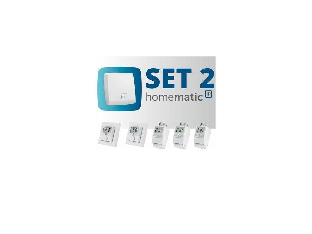 Rozšírená štartovacia súprava pre reguláciu vykurovania HmIP-SET2 na počiatočnú integráciu inteligentného domu Homematic IP. Súprava obsahuje šesť základných prvkov na spoľahlivé riešenie regulácie vykurovania a diaľkové ovládanie teploty v miestnosti podľa individuálnych potrieb, čo vedie k okamžitým úsporám a zníženiu nákladov na energie až o 30 %. Súprava obsahuje Centrálnu jednotku HmIP-HAP, 3x Termostatickú hlavicu HmIP-eTRV-2, 2x Nástenný termostat so snímačom teploty a vlhkosti HmIP-WTH-1 a bezplatnú mobilnú aplikáciu v CZ lokalizácii dostupnú pre operačný systém Android a iOS.