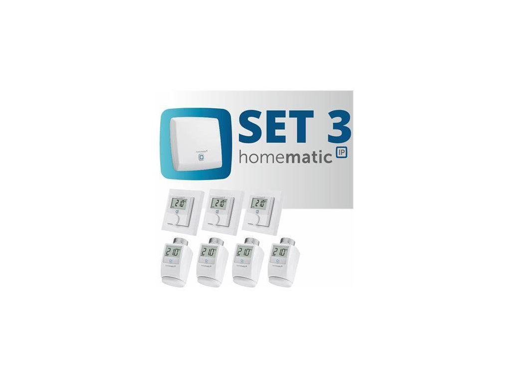 Štartovacia súprava HmIP-SET3 na ovládanie vykurovania pre počiatočnú integráciu inteligentného domu Homematic IP. Súprava obsahuje osem základných prvkov na diaľkové ovládanie teploty v miestnosti a procesu vykurovania podľa individuálnych potrieb, čo vedie k okamžitým úsporám a zníženiu nákladov na energie až o 30 %. Súprava obsahuje Centrálnu jednotku HmIP-HAP, 4x Termostatickú hlavicu HmIP-eTRV-2, 3x Nástenný termostat so snímačom teploty a vlhkosti HmIP-WTH-1 a bezplatnú mobilnú aplikáciu v CZ lokalizácii dostupnú pre Android a iOS.