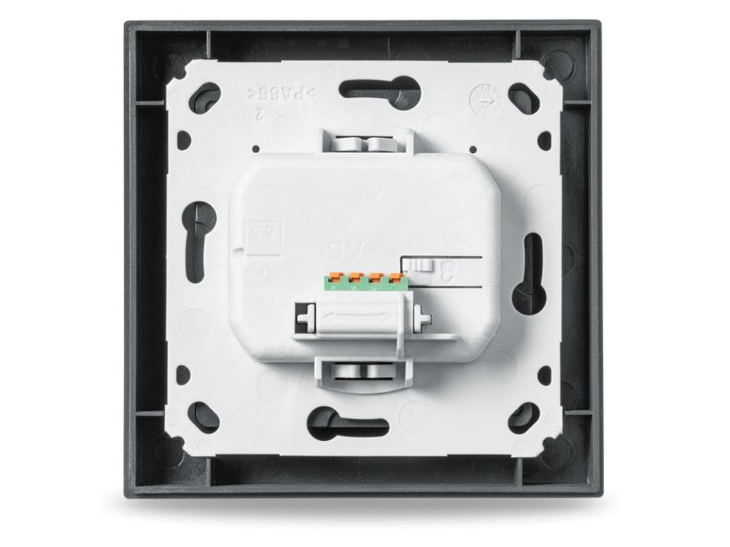 Dodávaná montážna doska je optimalizovaná pre jednoduchú montáž v zápustnej krabici. Odnímateľná push-in svorka uľahčuje pripojenie k drôtovej zbernici.
