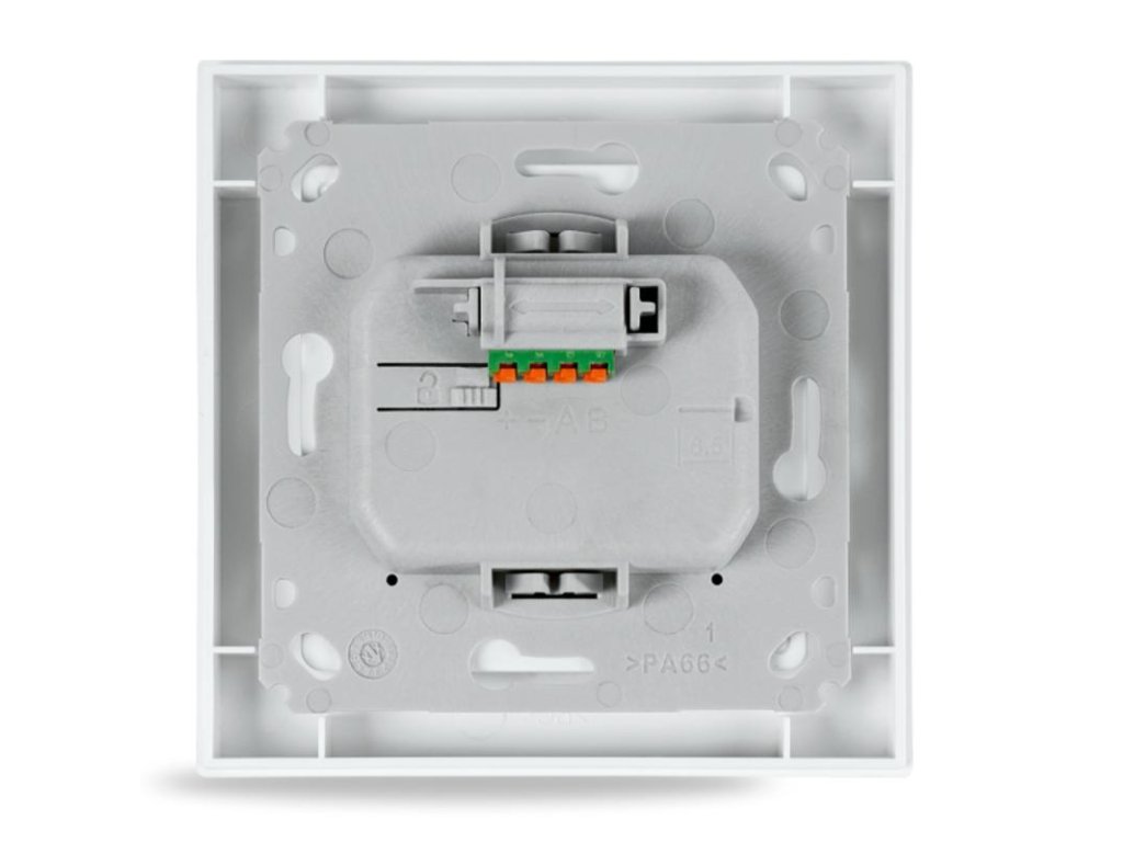 Dodávaná montážna doska je optimalizovaná pre jednoduchú montáž v zápustnej krabici. Odnímateľná push-in svorka uľahčuje pripojenie k drôtovej zbernici.