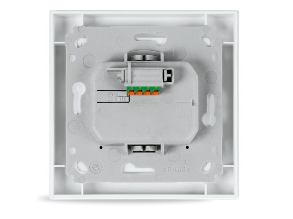 Dodávaná montážna doska je optimalizovaná pre jednoduchú montáž v zápustnej krabici. Odnímateľná push-in svorka uľahčuje pripojenie k drôtovej zbernici.